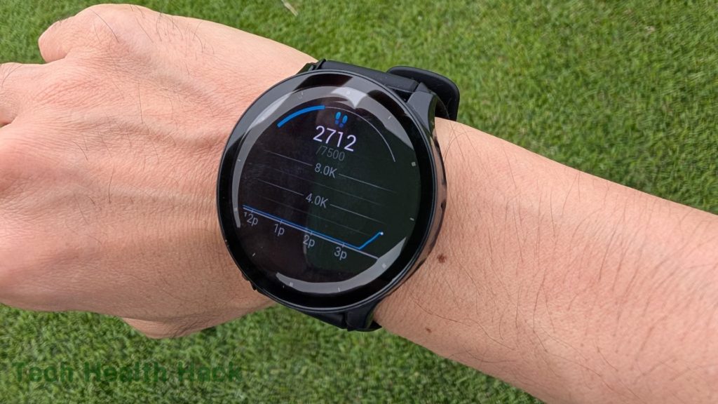 1.4インチのAMOLEDディスプレイは曇り空でも見やすくて、歩数や心拍数をサクッと確認できます。